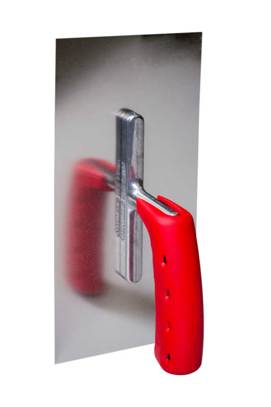 Glättkelle mit handgerechter hoher Alustütze und Softgriff. Blatt 0.7 m m stark aus Edelstahl Rostfrei.