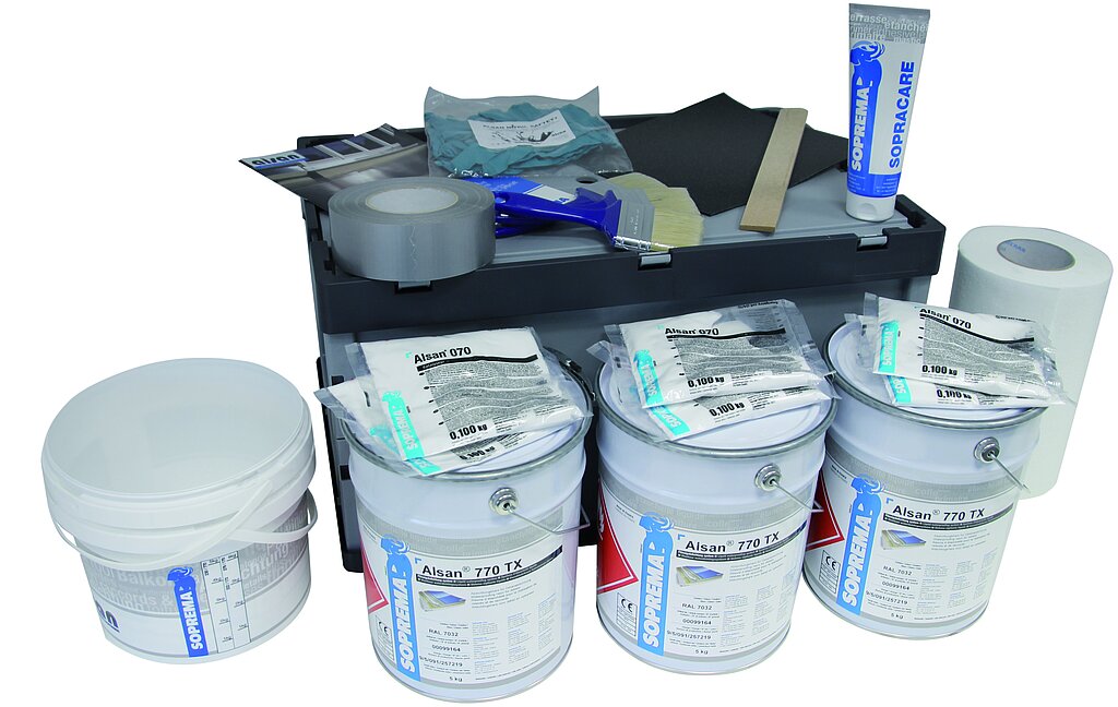 Inhalt Dichtbox: 3 x 5kg ALSAN 770 TX Abdichtungsharz 6 Beutel ALSAN Katalysator 25 Meter Vlies à 26 cm 2 Mischeimer à 5 Liter 1 Rührholz 2 Stück Schleifpapier 3 Pinsel 1 Rolle Klebeband 5cm/50m 4Paar Handschuhe 1 Tube SOPRACARE Handwaschpaste 1 Verlegeanleitung - Sicherheitsdatenblätter - Verlegeanleitung