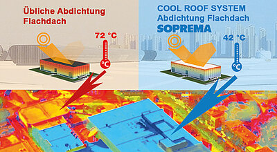 Mittels der Wärmebildkamera zeigt sich ein deutlicher Temperaturunterschied zwischen einem herkömmlich abgedichteten Flachdach und einem mit unserem SOPREMA COOL ROOF System.