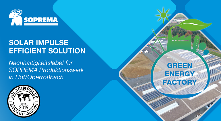 Die Stiftung Solar Impulse hat dem SOPREMA Produktionswerk in Hof/Oberroßbach das Efficient Solution Label verliehen. Dieses Label würdigt Lösungen aus unterschiedlichen Wirtschaftsbereichen, die Umweltschutz und Profitabilität miteinander verbinden und damit zeigen, dass nachhaltiges Wachstum machbar ist.